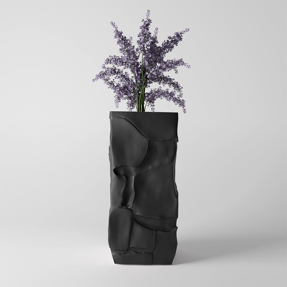 The surface is etched with deep creases and textured ridges, intentionally designed to resemble landscapes worn by pressure, wind, and sun. Each line is purposeful, capturing the raw beauty of nature’s imperfection. 3D printed to preserve this visual texture with precision, Craeg brings an elemental depth to modern interiors. It can be styled with dried florals or left bare, either way, it anchors a space with quiet strength.