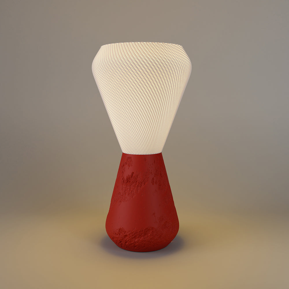 The shade is 3D printed to resemble woven stillness and diffusing a warm, ambient glow that feels less like lighting and more like presence. Kalm reflects balance: the tension between transience and permanence, movement and stillness.