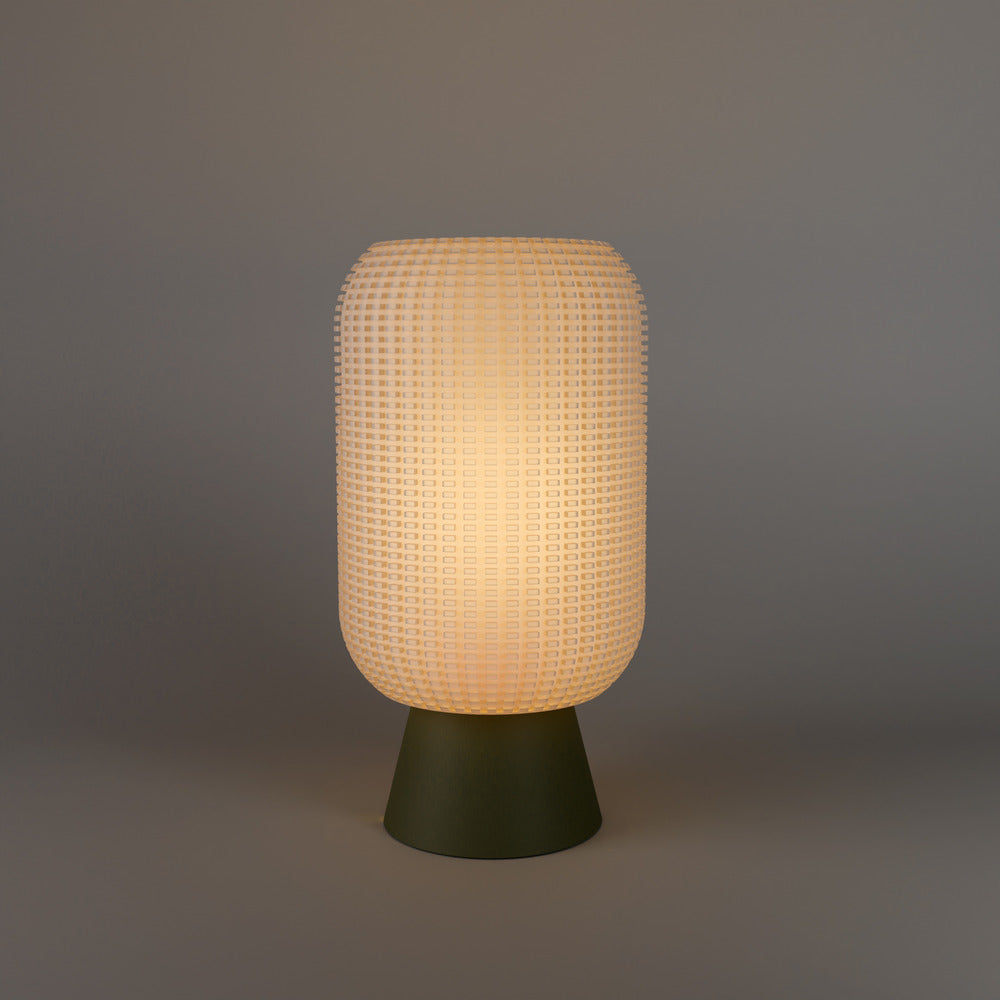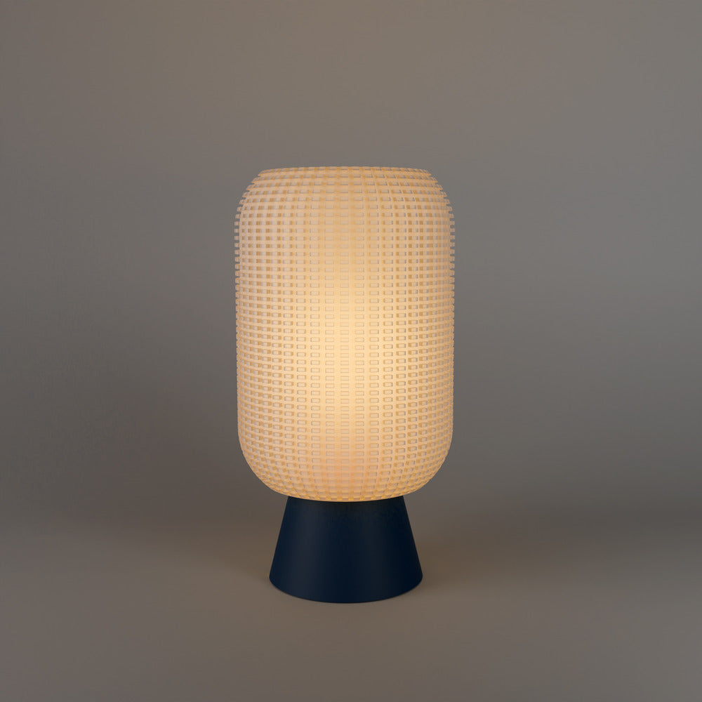 Tess is defined by its densely tessellated cylindrical surface, where repeated geometric perforations create a controlled interplay between structure and light. The textured outer shell filters light through a precise grid, producing a soft, pixelated glow that shifts subtly with viewing angle. Anchored by a tapered base, the silhouette feels stable and grounded while the shade introduces visual depth and dimension.